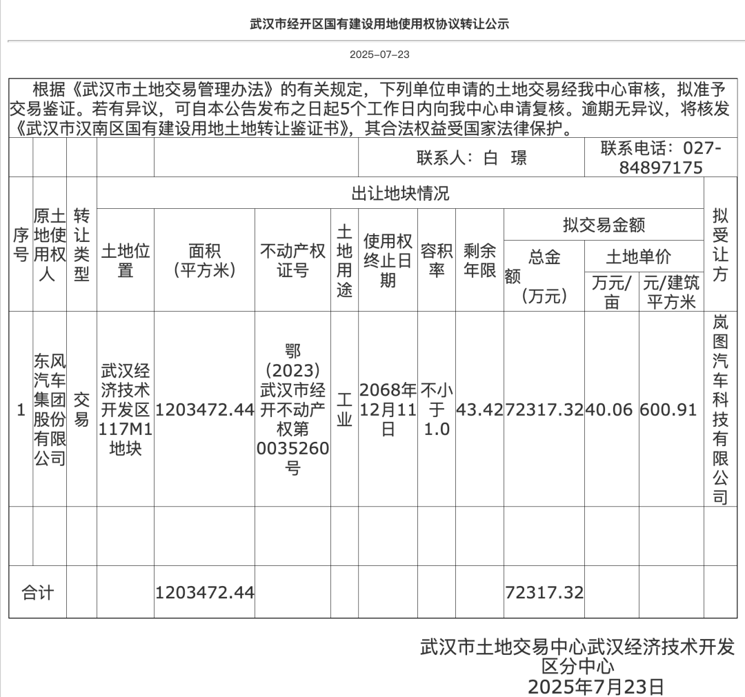 日前,武汉开发区(汉南区)国土规划局最新公示,岚图汽车以7.23亿元的价格完成对东风日产武汉云峰工厂的收购,转让方为东风汽车集团股份有限公司。